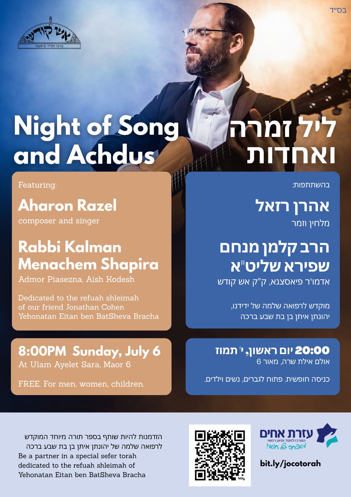 Join us Sunday July 6, 8PM at Ulam Ayelet Sara (Aish Kodesh, Maor 6)